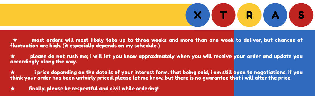 ★ i reserve the right to REFUSE to make any commission.★ the DEADLINE will be negotiated through private messages★ i reserve the right to post commissioned designs on SOCIAL MEDIA or use them in my portfolio unless explicitly stated★ revisions/redos are LIMITED and i will not do refunds, unless an error has been made on my part